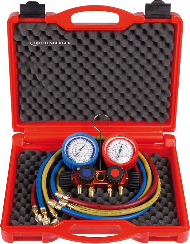Четырехпозиционный аналоговый манометрический коллектор и напорные шланги для хладагентов R410A, R32 Rothenberger Standard I 5/16 SAE (Ротенбергер Стандарт 1 5/16 САЕ) – долговечный высокоточный инструмент для профессионалов, работающих с системами охлаждения, для монтажа и обслуживания холодильной техники.