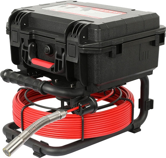 - Головка камеры Ø 21 × 45 мм и проталкиваемый кабель Ø 5,3 мм × 30 м из стекловолокна со счетчиком длины, подходящие для труб Ø 50 – 125 мм, длиной до 30 м