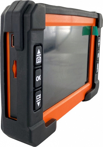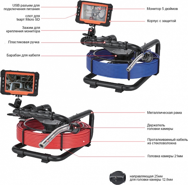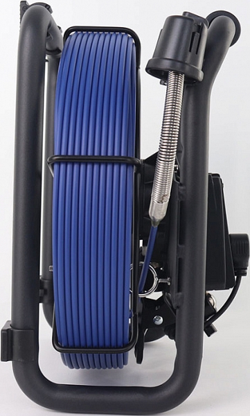 - Головка камеры Ø 12,8 × 21 мм и проталкиваемый кабель Ø 4,8 мм × 30 м из стекловолокна, подходящие для труб Ø 32 – 65 мм, длиной до 30 м