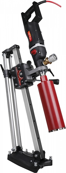 Станина для алмазного сверления с микроударом Bycon DBS-162 (Байкон ДБС-162) – сверхнадежная новейшая стойка для алмазного бурения c анкерно-вакуумным основанием, транспортировочными колесами, быстросъемным креплением двигателя для сверления отверстий Ø до 252 мм, в том числе и с микроударом.